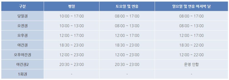 오전권, 오후권으로 낮 시간에 이용하실 분들은 당일권을 이용하는 것이 경제적입니다.
