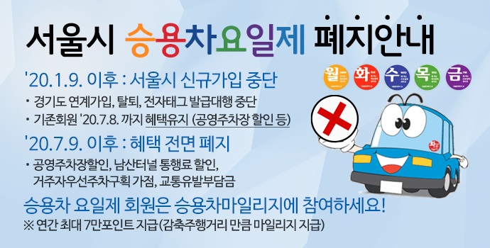서울시 승용차 요일제는 폐지되었고, 승용차 마일리지 제도가 생겼습니다.